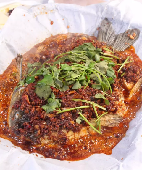 這是重慶“沈記烤匠”的蒜香烤草魚。